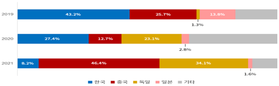 대한상공회의소(회장 최태원)가 최근 3년간(2019~2021년) ASEAN 수입 전기차 시장에서의 주요국 점유율 추이를 분석한 결과, 한국산 전기차가 차지하는 비중은 2019년 43.2%(1위)에서 2021년 8.2%(3위)로 크게 줄었다. 수입액으로 따져도 약 5,600만 달러에서 2,400만 달러로 절반 넘게 감소했다.